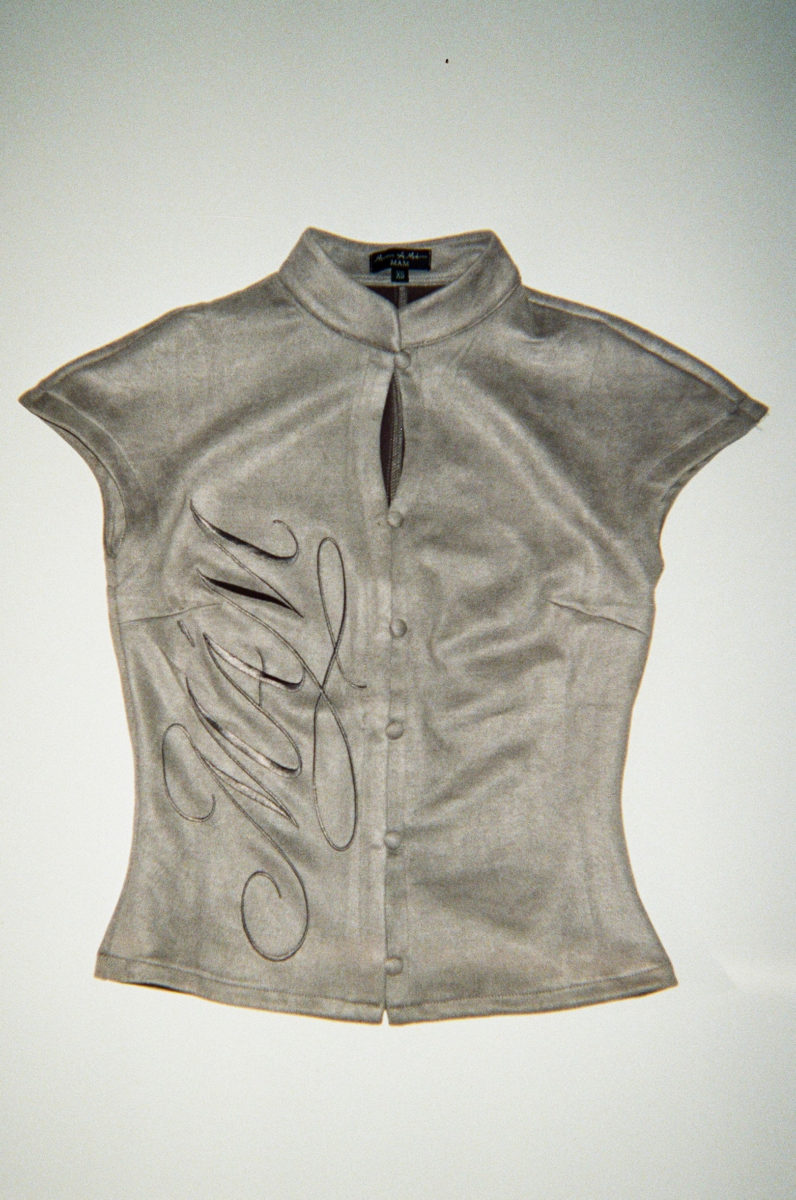 The short-sleeve top features a high collar, button-front closure, and subtle keyhole openings that add a refined touch of detail.